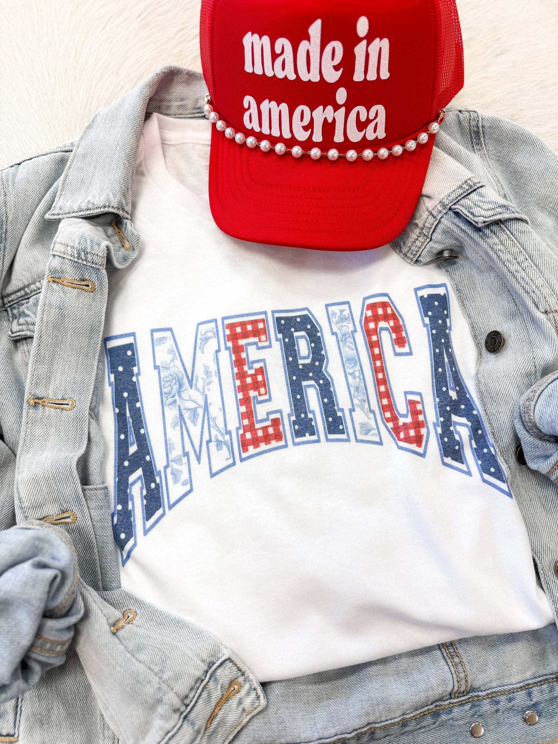 Our Hart and Hollow America Faux Appliqué Tee is an exclusive design sublimated on a Jerzee 50/50 tee, ensuring a comfortable fit and lasting quality. As two sisters who once owned a boutique, we now create exclusive designs for other boutique owners. This tee isn't just a piece of apparel; it's a reflection of your style and our love for creation.