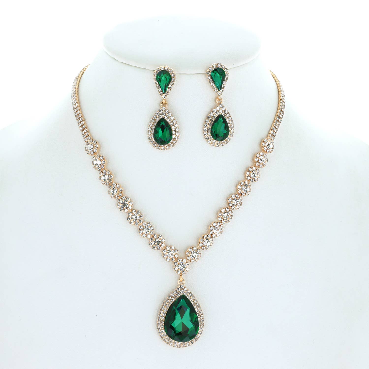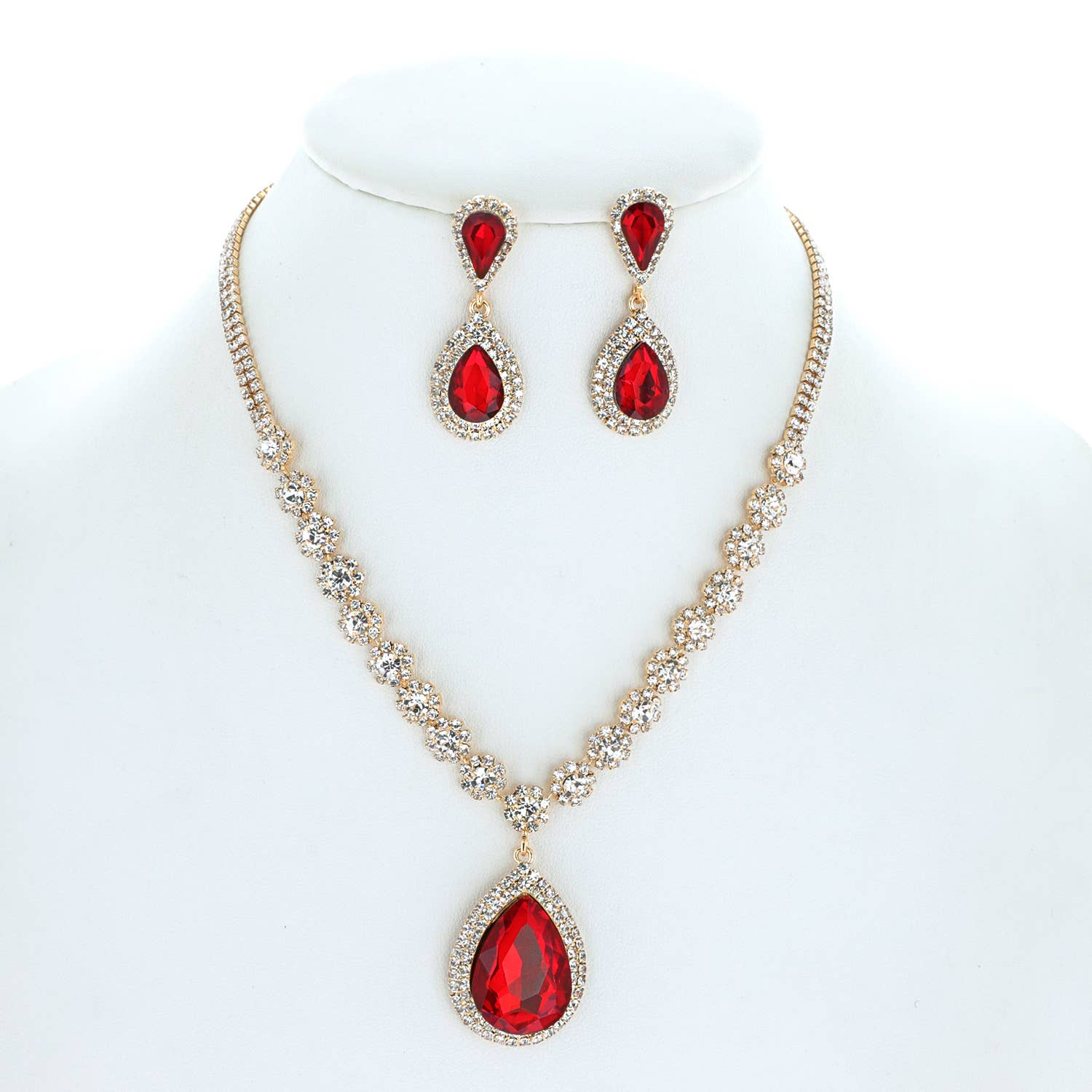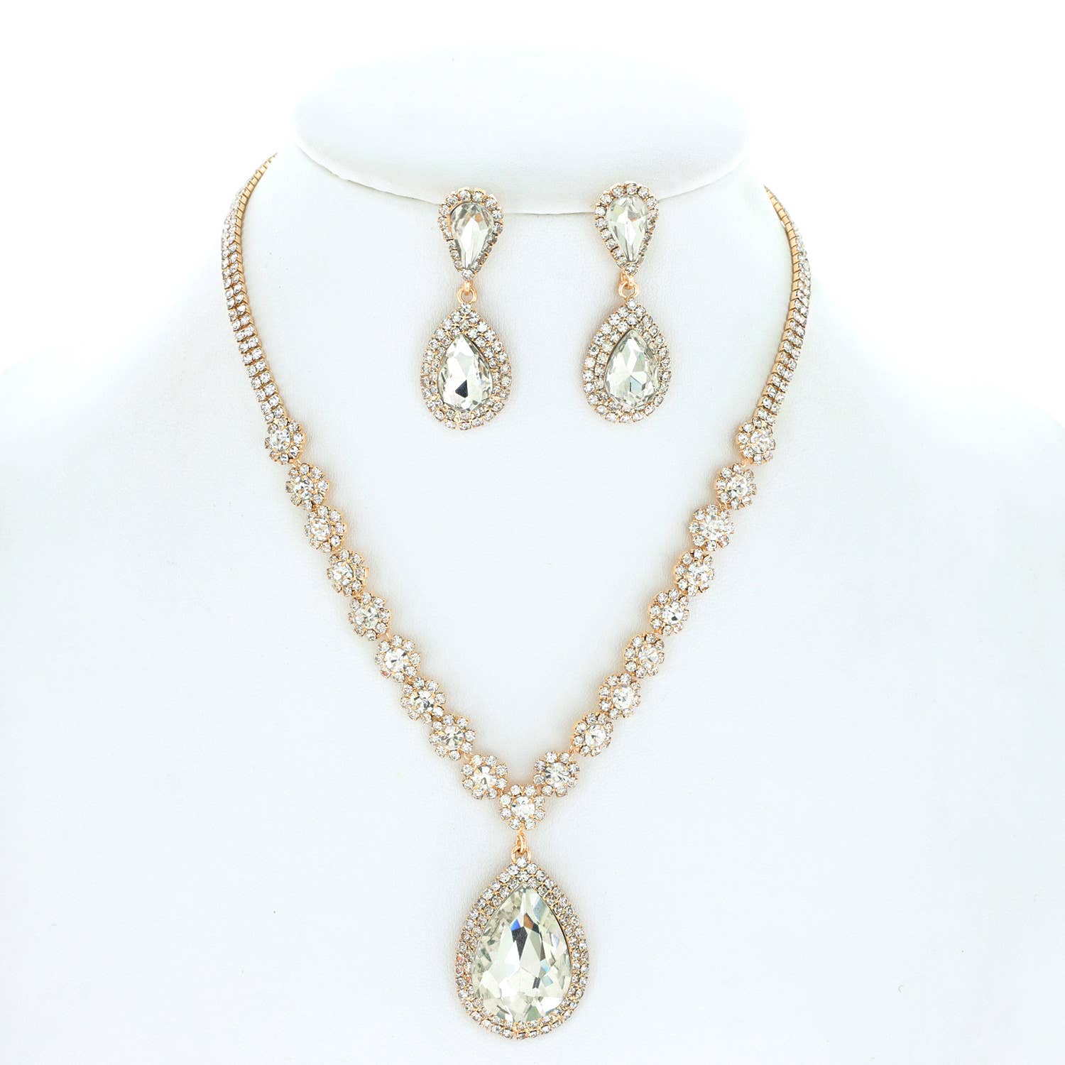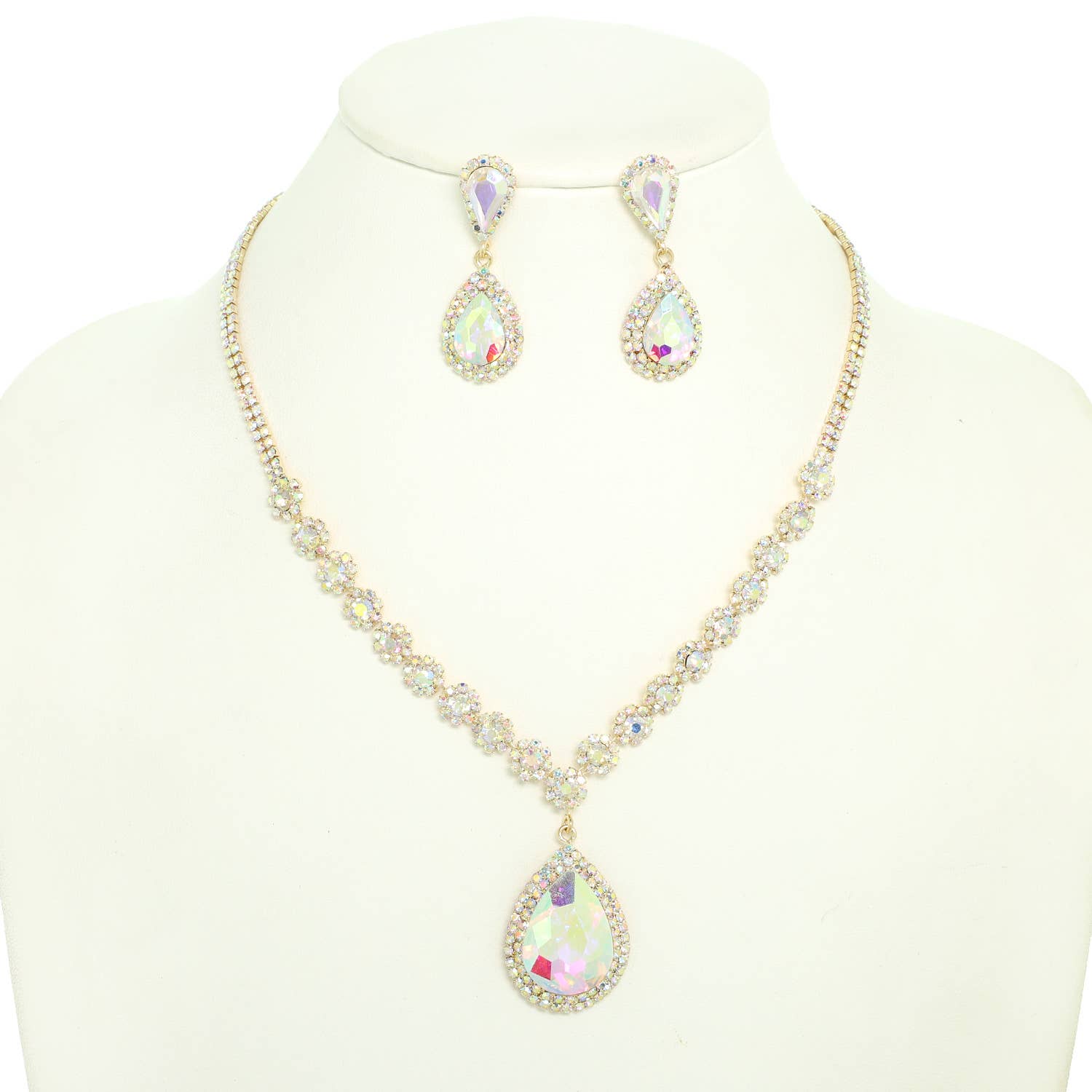 Large Rhinestone Teardrop Pendant Necklace & Earring Set: Gold Iridescent