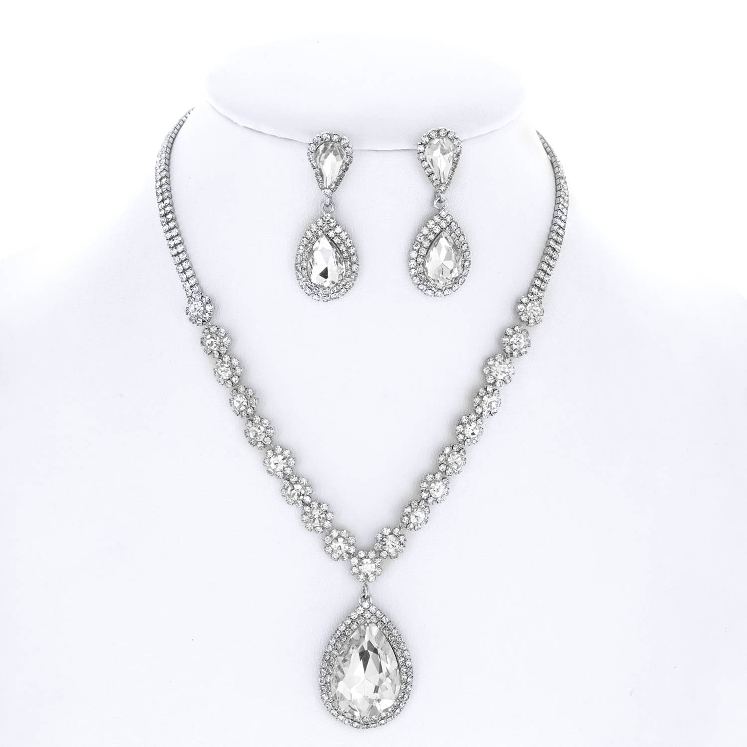 Add some glamour to your jewelry collection with this Large Rhinestone Teardrop Pendant Necklace & Earrings Set. This beautiful set features a stunning teardrop pendant encrusted with high-quality rhinestones that catch the light and sparkle with every move. The matching earrings complete the look, adding a touch of elegance to any outfit. The durable metal chain and lobster clasp ensure a secure fit, so you can wear this set with confidence. Whether you're dressing up for a special occasion or simply looking to add a touch of glamour to your everyday look, this Large Rhinestone Teardrop Pendant Necklace & Earrings Set is sure to become a staple in your jewelry collection.