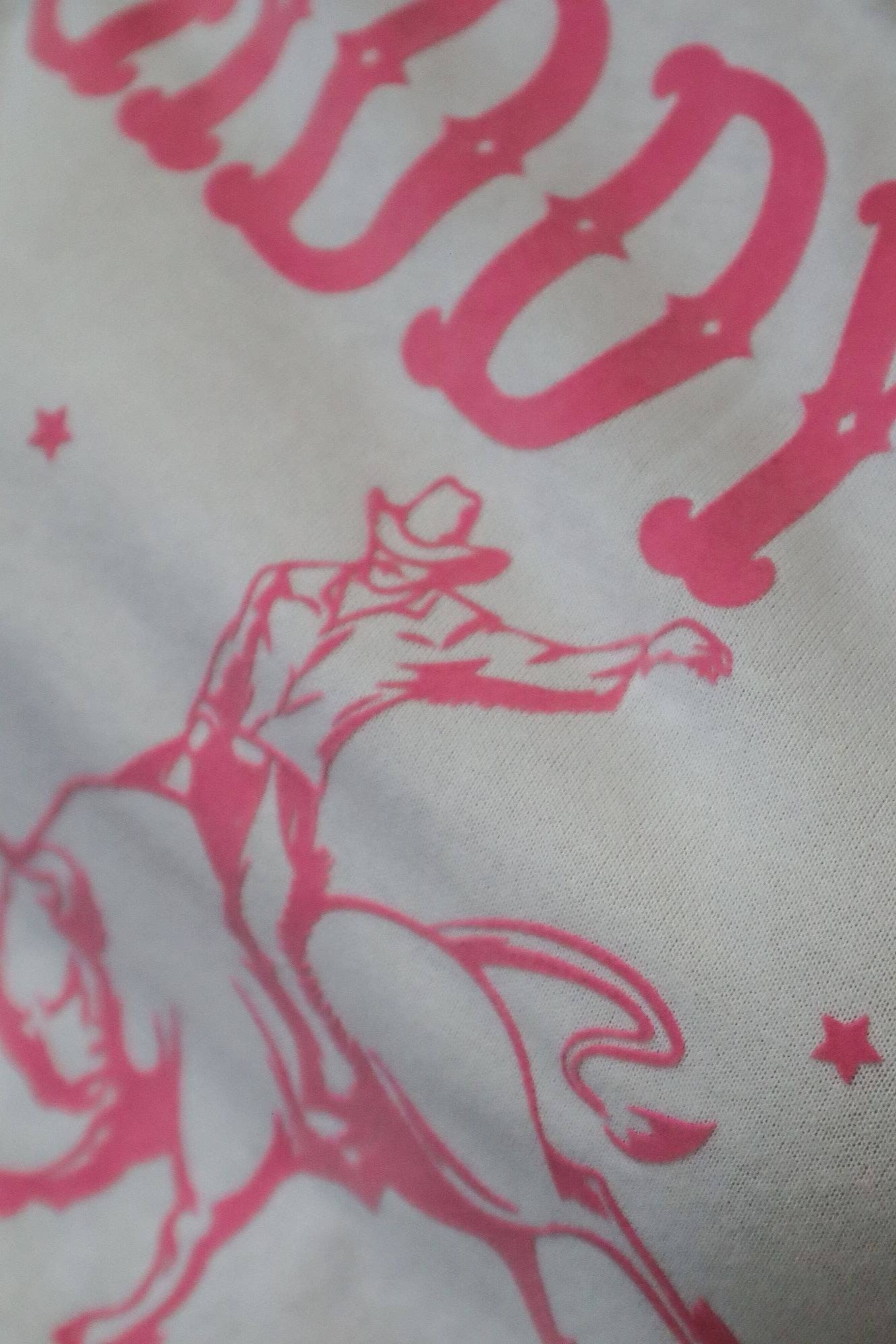 Fun and feminine, Giddy Up will do just that... get you out the door and on the road faster in a super cute western theme top for a no fuss fit! This buttery soft long sleeve tee features raw bottom hem, cuffed sleeve, crew neck, and bubble gum pink flocked design. Paired with your fave jeans, it's always a hit!