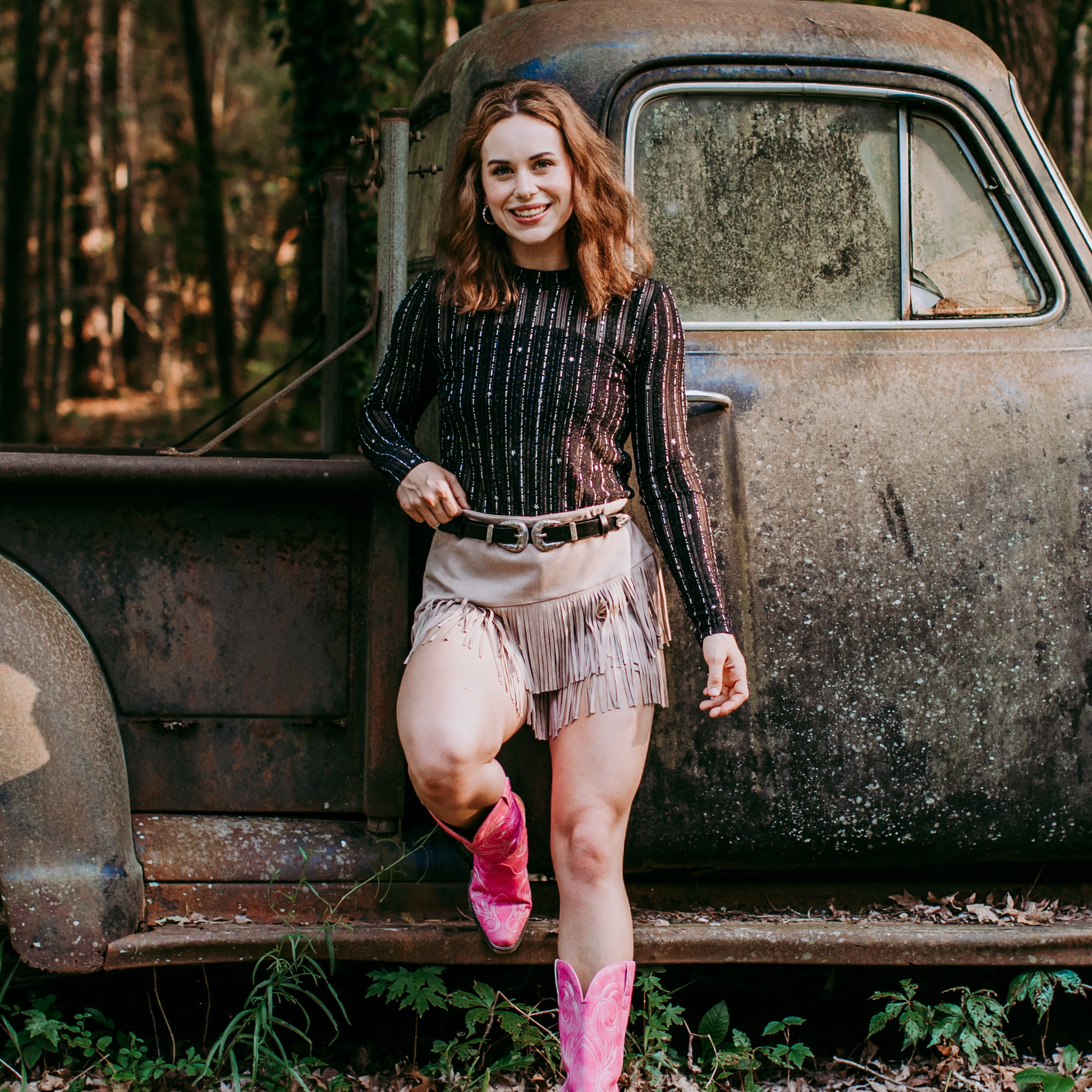 Long Sleeve Foil Embellished Mesh Top with Silver accents