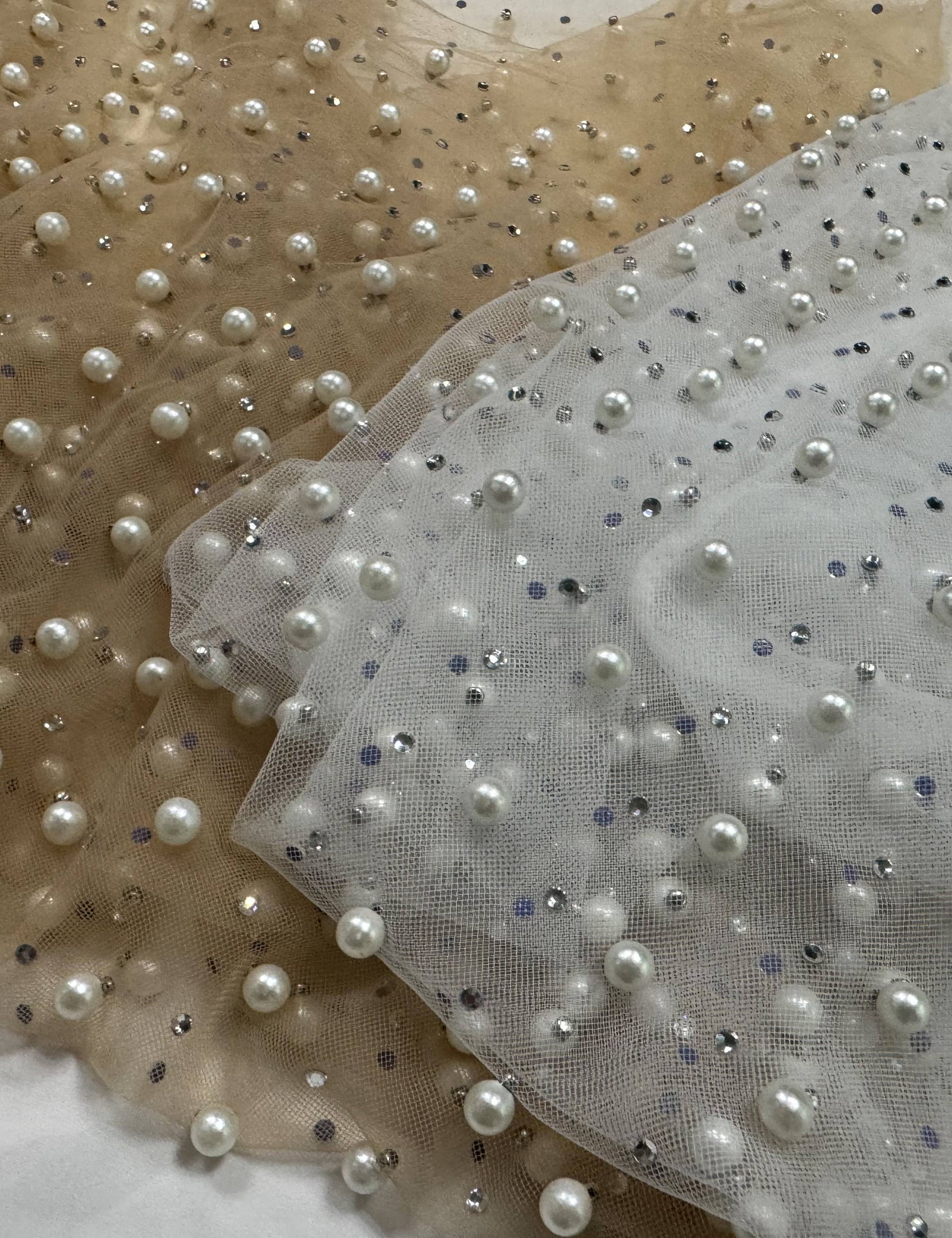Pearl Rhinestone Studded See Through Mesh Crop Top (Black)